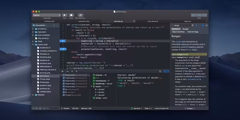 CodeRunner, an advanced, highly flexible, and easy-to-use programming editor, supports a large number of languages and delivers big IDE features while remaining lightweight and clutter-free. CodeRunner can run code in 23 languages out of the box and can be easily extended to run code in any other language. Notable features include debugging with breakpoints in lots of languages, IDE-level code completion, and lots of other high-end features, making it easier than ever to write and work with code.