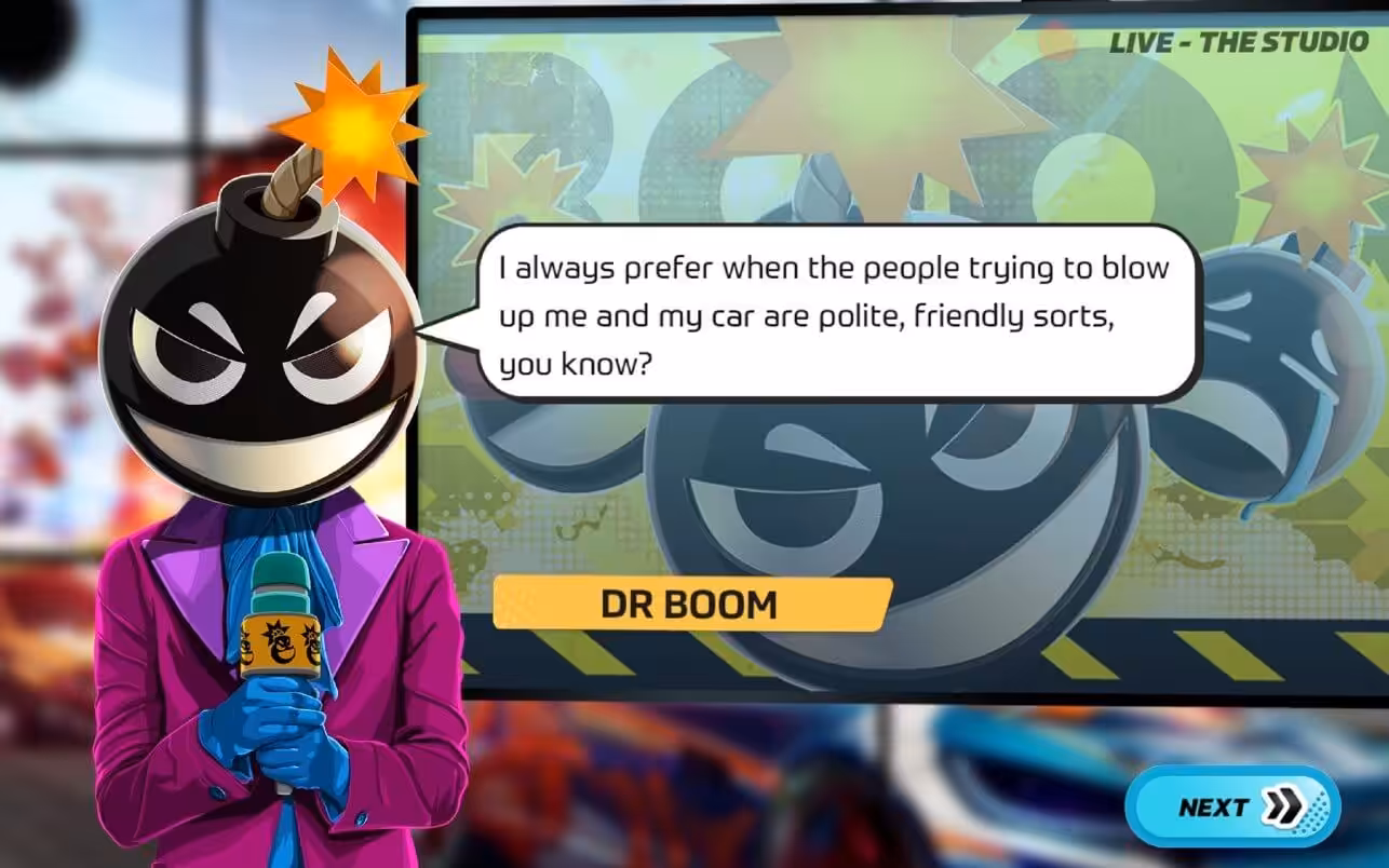 Welcome to Detonation Racing, the most dangerous, least sensible racing series ever devised! I’m Dr. Boom and it’s all my fault… Why are we here? So you can drive far too quickly and, ooh, I dunno, how about dropping a nuclear-powered submarine onto the track to destroy the other racers? Just to claim victory for your own selfish ends? What kind of person are you?