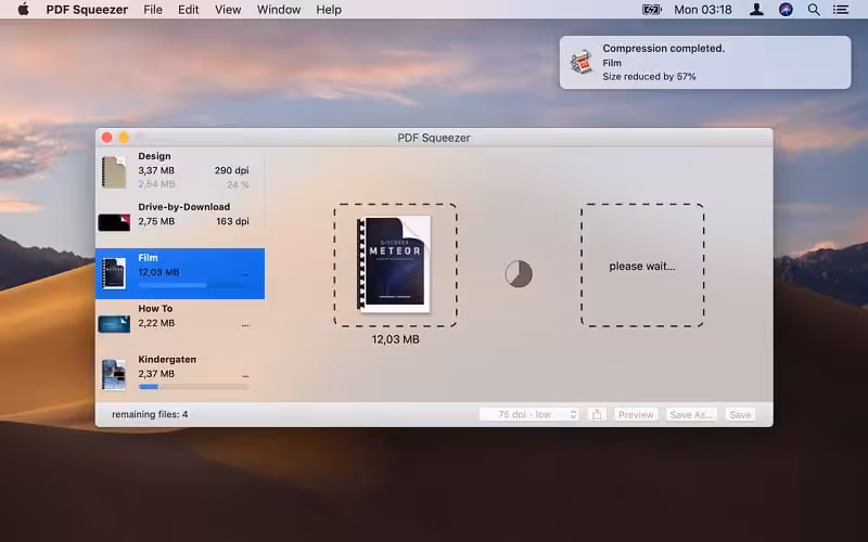PDF Squeeze is an easy-to-use PDF compression tool. It reduces the size of large PDF documents by compressing images and removing irrelevant information. This will help you obtain important savings in bandwidth costs, digital storage costs, and network transmission times. The last save destination is now remembered after saving the compressed file once.