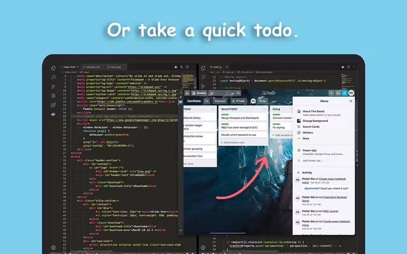 With simple slide-in and slide-out gestures, Slidepad delivers iPad-style multitasking to your Mac. It is the fastest way to open and close your productivity apps such as Trello, Todoist, Slack, etc., without them dominating your workspace, or obstructing your workflow.