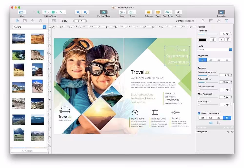 Swift Publisher is a page layout and desktop publishing app for Mac. This software provides all you need to create effective desktop publishing materials, such as flyers, brochures, catalogs, magazines, booklets, newsletters, calendars, posters, menus, cards, Facebook and Twitter covers, ad banners, and many more.